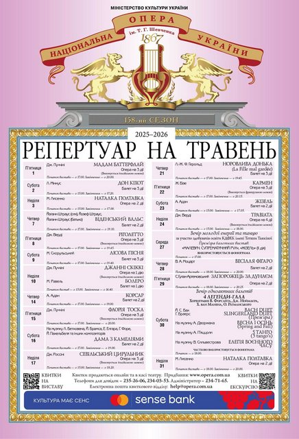 На останній місяць весни колектив Національної опери України підготував своїм шанувальникам чимало цікавих музичних подій. Тут і другий прем’єрний показ Вечора одноактних балетів «4 Легенди – гала». Тут і твори золотого фонду національного репертуару – опери «Наталка Полтавка» та «Запорожець за Дунаєм» і балет «Лісова пісня», які завжди збирають аншлаги.