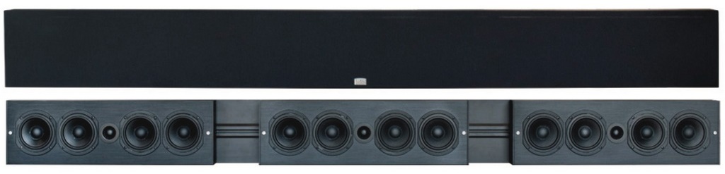 Каждый из этих саундбаров состоит из трех одинаковых колонок. В корпусах из экструдированного алюминия размещены симметрично 0,75-дюймовый твитер с мягким куполом, а также два 3-дюймовых вуфера с полипропиленовыми диффузорами. Еще две 3-дюймовые полипропиленовые басовые радиаторы расположены по бокам. Все это закрыто аккуратным тканевым грилем, придающим устройству стандартный вид саундбара.